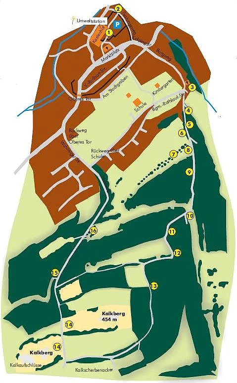 Diese Beschreibung des Lehrpfads, die Fotos und die abgebildete Karte wurden dem Faltblatt über den Lehrpfad Kalkberg entnommen.