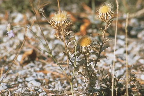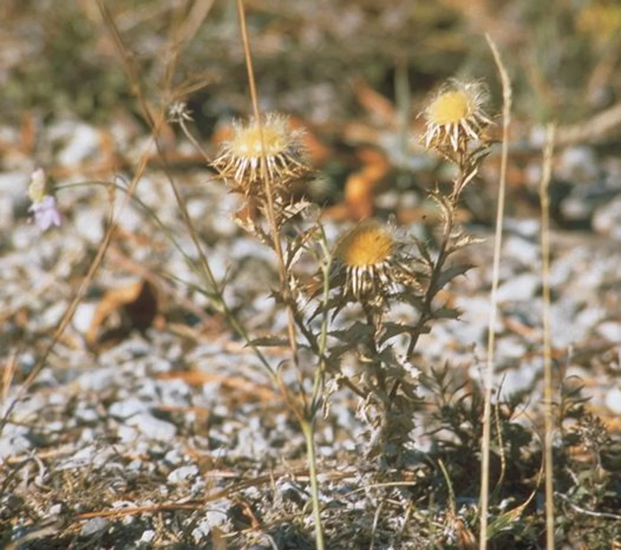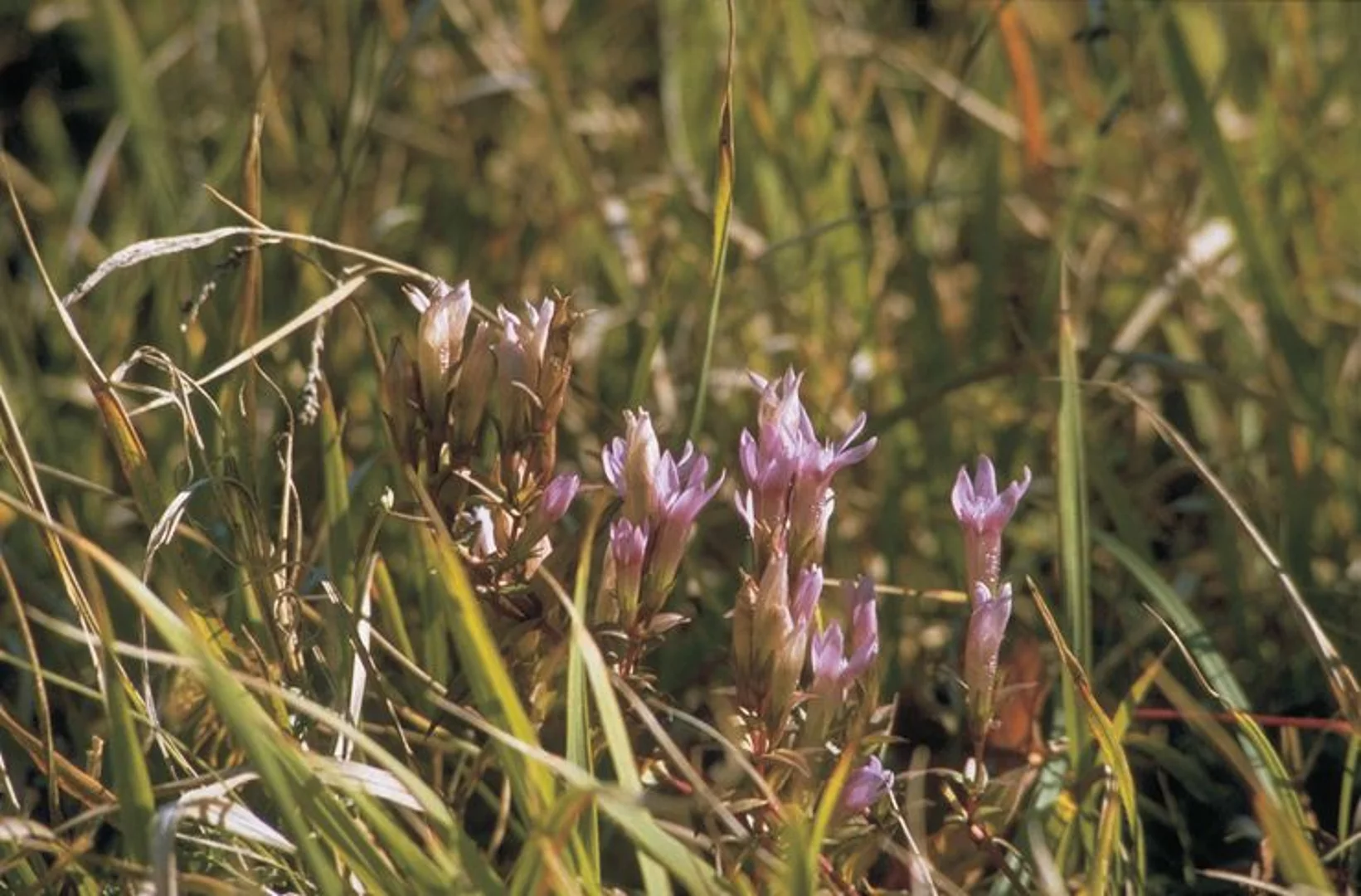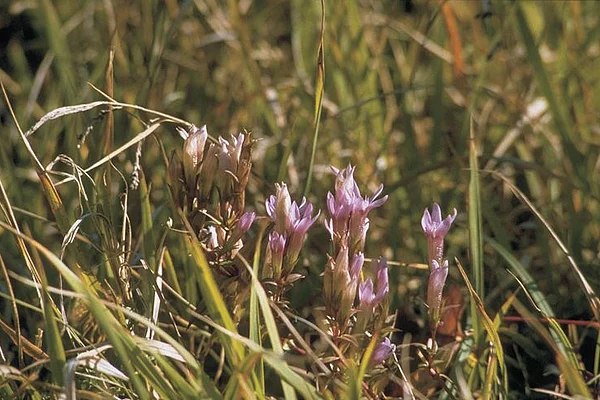 Unterhalb der Gipfel finden sich die Magerrasenflächen mit typischen Pflanzenarten, hier der Deutsche Enzian und die Gold-Distel.